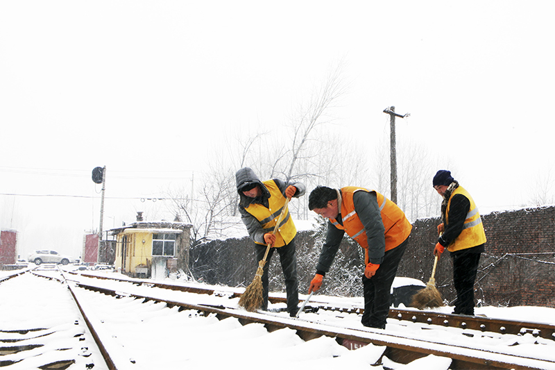 圖二:該礦運(yùn)銷部組織職工在清掃線路道岔積積雪,保障鐵路安全暢通。