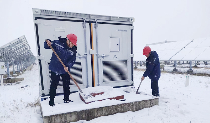 光伏電站工作人員及時清理逆變器周邊積雪,保障設(shè)備安全運(yùn)轉(zhuǎn)。