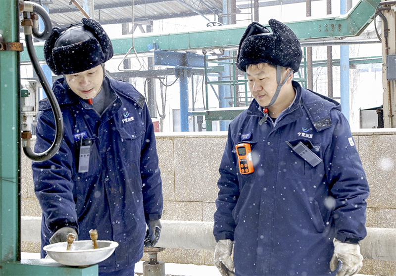 圖片說明:2月3日,寧夏中衛(wèi)市迎來了強(qiáng)降雪天氣,天寒地凍、白雪飛舞,寧夏潤夏能源化工公司濃硝酸車間三組現(xiàn)場巡檢人員在裝置現(xiàn)場檢查重大危險(xiǎn)源硝酸罐區(qū)洗眼器出水是否正常。