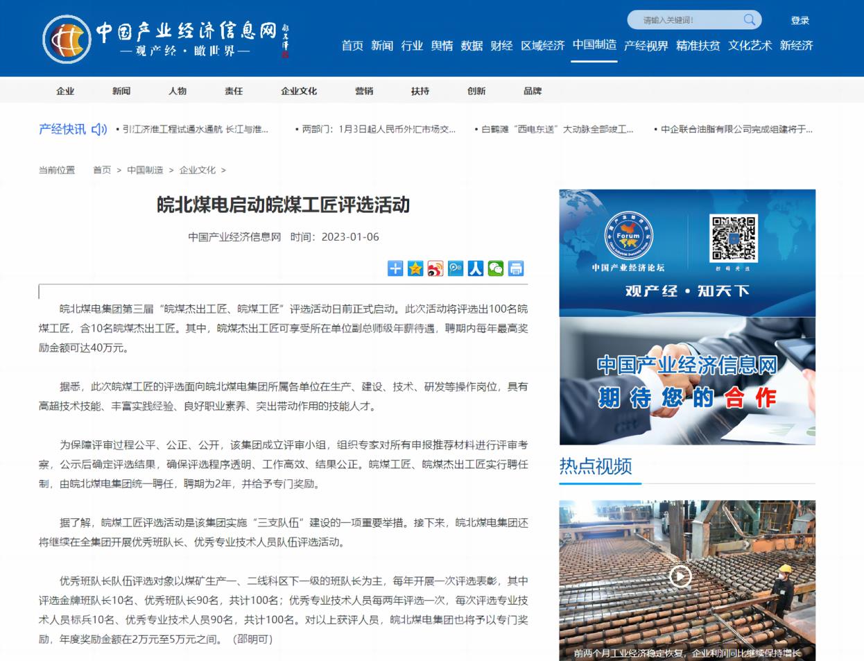 1月6日中國產(chǎn)業(yè)經(jīng)濟(jì)信息網(wǎng):皖北煤電啟動(dòng)皖煤工匠評選活動(dòng)
