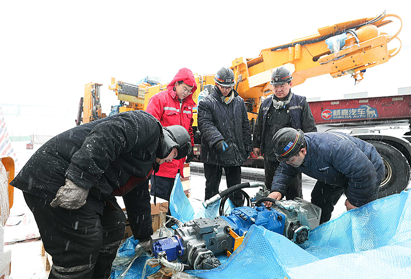 圖片說明:麻地梁煤礦掘進(jìn)區(qū)第二套掘錨成套裝備裝備頂風(fēng)冒雪進(jìn)場,組織精干人員開展設(shè)備組裝工作。